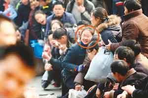 回到隊伍末端,瘦小男子只得重新排隊。他一臉無辜的自稱涪陵區(qū)人,名叫孫文件,在天津打工,從13日便開始候票。孫先生告訴記者,排在隊伍前面的一半左右的人都是票販子。他說,之所以這么肯定這些插隊的人是票販子,是因為他認得其中一個,那個人13日下午向他兜售過到北京的硬坐車票,加價250元,他沒敢要。