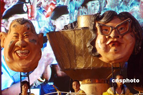 2007年,香港明星曾志偉、沈殿霞的大頭像出現(xiàn)在深圳世界之窗舉行的“花開正十年”大型聯(lián)歡晚會巡游行列中。中新社發(fā) 陳文 攝