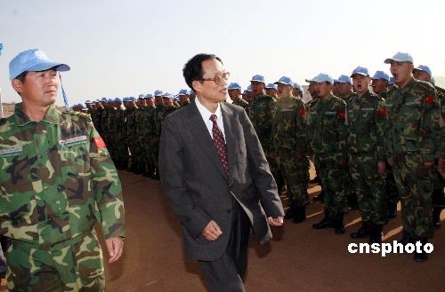 2月26日,中國(guó)政府達(dá)爾富爾問題特別代表劉貴今來到中國(guó)維和多功能工兵分隊(duì)慰問,中國(guó)維和工兵分隊(duì)是首個(gè)非洲之外國(guó)家派遣的維和部隊(duì),他們近日已搬進(jìn)位于蘇丹南達(dá)爾富爾的營(yíng)地。中新社發(fā) 李鵬 攝