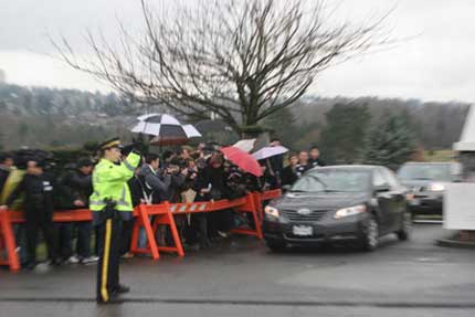 從昨天便開始封園的科士蘭紀念墓園,今天戒備森嚴。部分早上8點多進入墓園內(nèi)的媒體,到上午9點時全部被本拿比皇家騎警請出墓園范圍,統(tǒng)一集中在墓園東門守候。而肥肥的墓地卻在墓園的最西邊。