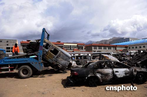3月19日,拉薩市城關(guān)區(qū)環(huán)保局的工作人員正集中處理被焚車(chē)輛。