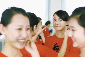 于是,姑娘們每天對著鏡子練微笑。老師要求每個(gè)人在練習(xí)笑容時(shí),嘴里都要咬著一根筷子找感覺。這樣一笑就得幾十分鐘,笑得連臉部肌肉都麻了,有時(shí)甚至?xí)テ谱臁?/p>
