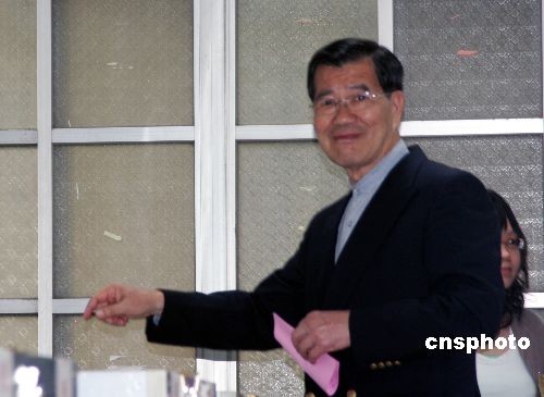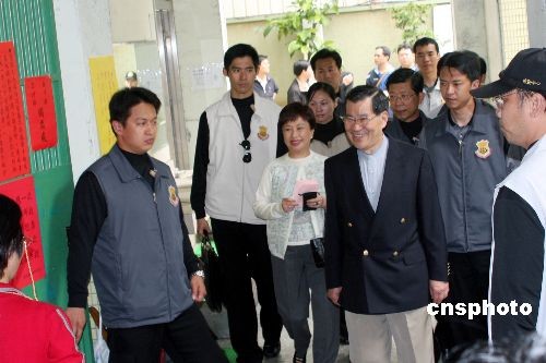 二00八臺灣地區(qū)領導人選舉投票三月二十二日舉行,中國國民黨候選人蕭萬長與夫人在臺北一個投票所投票。中新社發(fā) 黃少華 攝