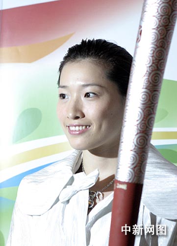 北京奧運(yùn)會火炬希臘傳遞的第一位中國火炬手羅雪娟3月23日晚身著白色禮服出席晚宴,圖為其手持祥云火炬接受媒體拍照。中新社記者:王歡