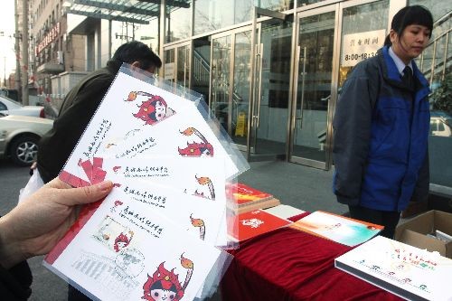 3月24日,北京百萬莊郵局工作人員正在發(fā)售《第29屆奧林匹克運(yùn)動會--火炬接力》紀(jì)念郵品。當(dāng)日,2008年首套奧運(yùn)郵票《第29屆奧林匹克運(yùn)動會--火炬接力》正式發(fā)行。中新社發(fā) 追影 攝
