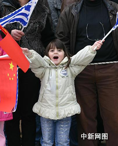 3月25日,北京2008年奧運圣火希臘傳遞第二天,慶典儀式在終點約阿尼納舉行。小市民高舉中國和希臘國旗歡迎北京奧運圣火到來。中新社記者 王歡