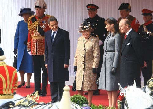 法國(guó)總統(tǒng)薩科齊與新婚夫人布魯尼抵達(dá)倫敦,開始其首次對(duì)英國(guó)的國(guó)事訪問。當(dāng)?shù)貢r(shí)間26日中午,英國(guó)女王伊麗莎白二世在溫莎城堡舉行儀式,歡迎薩科奇到訪。圖中前自左至右分別為薩科奇、伊麗莎白二世、布魯尼、菲利普親王。中新社發(fā) 李鵬 攝