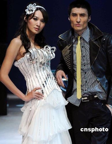 圖為名模胡東(右)、韋杰(左)現(xiàn)場演繹拉鏈時裝秀。