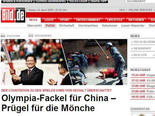 然而,CNN并不是唯一一家歪曲報(bào)道西藏事件的媒體,也不是最有“創(chuàng)意”的媒體。《德國(guó)畫報(bào)》在最近的報(bào)道中所使用的圖片顯然比CNN更有“才”!兜聡(guó)畫報(bào)》多次將尼泊爾警察在加德滿都驅(qū)散游行示威者的圖片進(jìn)行裁剪、拼接,然后配在談?wù)摫本⿰W運(yùn)的文章中,標(biāo)題竟用“西藏事件升級(jí),應(yīng)該抵制奧運(yùn)會(huì)嗎?”(人民網(wǎng)4月5日電)