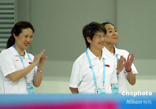 圖為中國花游日籍主教練井村雅代(中)及教練組成員在場(chǎng)邊為隊(duì)員的優(yōu)異表現(xiàn)喝彩。中新社發(fā) 富田 攝