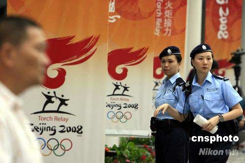 香港奧運(yùn)火炬?zhèn)鬟f路線預(yù)演,俏麗警花維持秩序。 王麗南 攝
