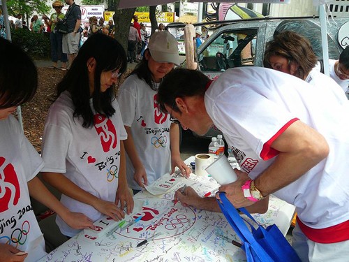 在現(xiàn)場擺設的“簽名支持北京奧運”攤位前,光臨這里的美國客人從開攤到收攤一直絡繹不絕。有許多美國朋友在聽留學生們講完關(guān)于“北京奧運對于中國人民的重大意義”, “北京奧運目前的籌備情況”等話題之后,當即表示,我們完全支持你們的北京舉辦這屆奧運會,我們不同意任何人提出的“抵制北京奧運”的任何理由。有幾位曾經(jīng)到過北京的美國人對他們的同伴介紹說:我門去過北京的,那是一個既古老又新興的漂亮城市,在北京舉辦奧運會,絕對是本屆奧運會的最佳選擇! 他們都十分肯定地在由中國留學生準備的簽名大橫幅上簽下了自己的名字。