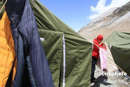 圖:珠峰大本營(yíng)記者抓緊時(shí)機(jī)晾曬臥具 (2)