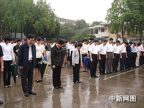 五月十九日十四時二十八分,近千名福建漳州市黨政機關(guān)干部冒著綿綿細(xì)雨,在政府大院的國旗下默哀,深切哀悼四川汶川大地震遇難同胞。正在當(dāng)?shù)乜疾斓娜珖舜蟪N瘯蔽瘑T長陳至立(前排左二),和福建省政府、人大官員一起參加默哀。呂峰鵬 攝