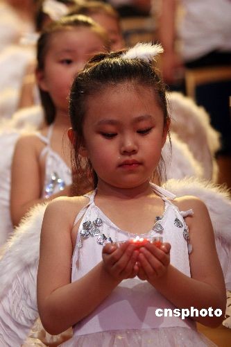 2008年5月19日,河南電視臺都市頻道舉行賑災捐款晚會,來自鄭州多所學校的小學生手舉“和平鴿”為四川地震災區(qū)人民祈福。