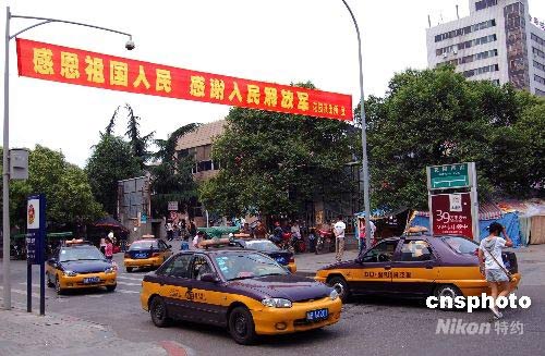 5月26日,四川地震災(zāi)區(qū)綿陽街頭打出“感恩祖國人民,感謝人民解放軍”的橫幅。四川汶川8級大地震發(fā)生后,中國各地發(fā)揚“一方有難 八方支援”的精神,以捐款捐物、救治傷員、對口支援等形式全力支持災(zāi)區(qū)抗震救災(zāi),約有10萬余名軍隊人員參與到此次救援抗災(zāi)中。中新社發(fā) 劉萬強 攝