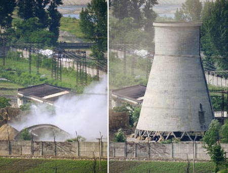 我們曾驚詫于朝鮮反復(fù)的核政策,以及六方會談協(xié)議屢次“被架空”的怪現(xiàn)狀。我們曾遠遠地觀望這個國家對“核”的情感,并作出各種正確或有失偏頗的解讀。如今,為了“慶!睂庍吥莻高大的冷卻塔轟然倒地,我們才得以一窺神秘的朝鮮“核”心