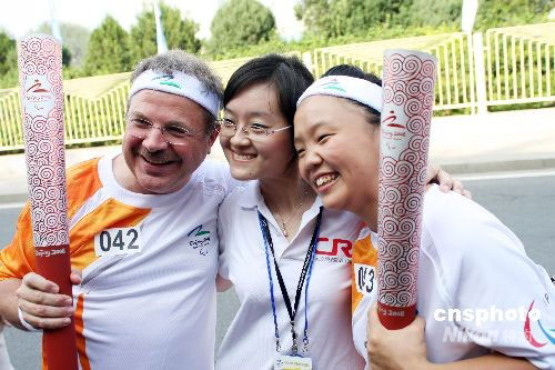 9月4日,殘奧會火炬到達北京,將在北京的“一壇兩園”展開最后一天傳遞行程。據(jù)北京市體育局副局長孫學才介紹,北京地區(qū)的240名火炬手既有工作在基層一線的普通勞動者,又有體壇名將、文藝工作者。其中,殘疾人士共70名,占火炬手總數(shù)的近30%。中新社發(fā) 王昊 攝