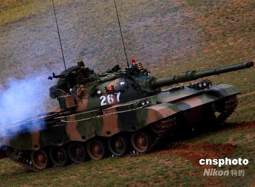 參加“礪兵--2008”演習的中國人民解放軍部隊,9月22日在北方某地進行紅、藍軍聯(lián)合演練。參演雙方主力分別是濟南軍區(qū)某機械化步兵旅和北京軍區(qū)某裝甲團!八{方A作戰(zhàn)集團”主力北京軍區(qū)裝甲團,是一支裝備新型坦克,在全軍率先完成主戰(zhàn)裝備的信息化改造,具備復雜電磁環(huán)境下作戰(zhàn)能力的裝甲勁旅!凹t方B作戰(zhàn)集團”以濟南軍區(qū)機步旅為主,加強陸航空降兵兵力。解放軍新型主戰(zhàn)坦克亮相。中新社發(fā) 宋吉河 攝