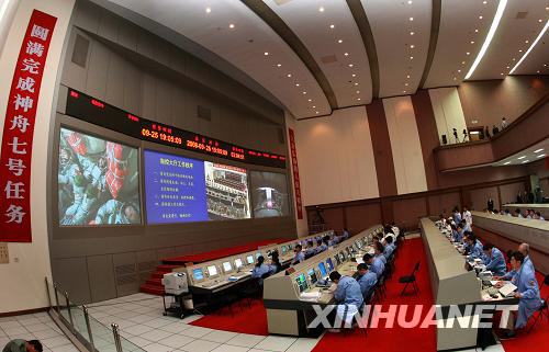 9月25日晚,工作人員在北京航天飛行控制中心緊張工作。目前,北京航天飛行控制中心已準備就緒。龐興雷 攝