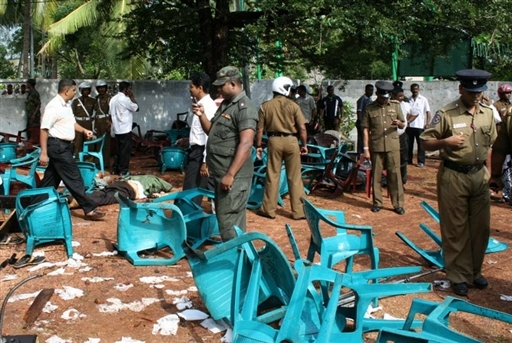 10月6日,在斯里蘭卡北部阿努拉德普勒鎮(zhèn),安全人員查看爆炸現(xiàn)場。當天上午,一名自殺式襲擊者在阿努拉德普勒鎮(zhèn)老汽車站附近引爆了身上的炸彈。包括斯前陸軍參謀長佩雷拉及其夫人在內(nèi)的至少27人在爆炸中死亡。