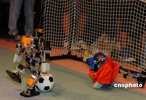 圖為參展的機器人在進行射門和防守對抗。中新社發(fā) 朱沿華 攝