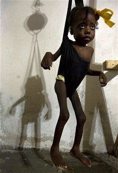 今年,由于風(fēng)暴襲擊,海地60%的糧食收成被橫掃一空。在某些地區(qū),無國界醫(yī)生組織發(fā)現(xiàn),營養(yǎng)不良的比例高達5%,其中,兒童更是受害最大的人群。據(jù)美聯(lián)社報道,無國界醫(yī)生組織比利時分部的負(fù)責(zé)人馬克斯.科斯奇表示,除了這26名孩子,還有65個嚴(yán)重營養(yǎng)不良的兒童被送到臨時搭建的山區(qū)帳篷診所及太子港等地區(qū)的醫(yī)院接受治療!坝幸粋孩子在治療中死去了”。這些孩子的癥狀包括腸胃萎縮,因營養(yǎng)不良導(dǎo)致色素減少、發(fā)色變淡,有些甚至出現(xiàn)了浮腫,這是因蛋白質(zhì)缺乏引起的功能紊亂癥狀。