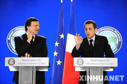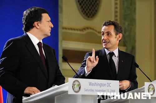 11月15日,在美國首都華盛頓出席二十國集團領導人金融市場和世界經濟峰會的法國總統(tǒng)薩科齊(右)和歐盟委員會主席巴羅佐聯(lián)合舉行新聞發(fā)布會。 新華社記者張巖攝