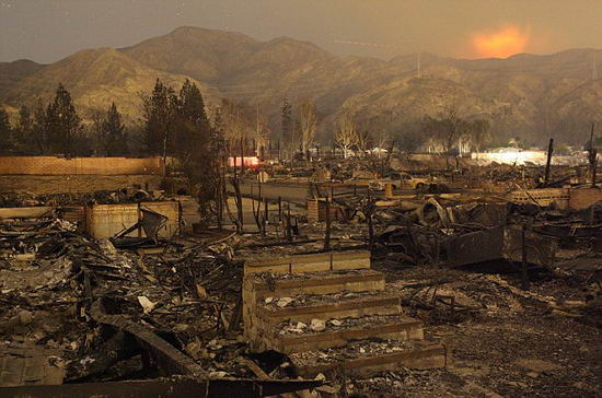 大火是上周四晚上在人口密集的圣費爾南多山谷燃起的,摧毀了數十間房屋,并對關鍵的電力供應線路構成了威脅。大火在風力的幫助下燒過干燥的山谷和山坡,熱風使當地溫度達到創(chuàng)記錄的30度。火勢在時速達112公里的強風的幫助下蔓延了2600英畝,迫使1萬名居民撤離,自上周四以來,過火面積已超過20000英畝,發(fā)生火情的地區(qū)包括洛杉磯北部的山丘、東南部的奧蘭治縣山谷、北部圣巴巴拉縣附近名人聚集的蒙特其托居住區(qū)。估計有1000套房屋被燒毀。加州州長施瓦辛格在視察火災造成的損失情況后稱:“對于南加州人來說,過去的幾天非常艱難!