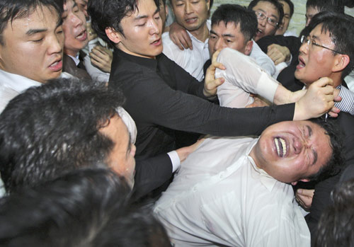 在野黨議員與執(zhí)政黨議員扭打在一起。