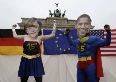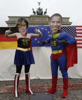 中新網(wǎng)6月26日電 據(jù)星島環(huán)球網(wǎng)報道,德國一個氣候活動組織25日在柏林勃蘭登堡門前抗議。他們扮成德國總理默克爾和美國總統(tǒng)奧巴馬的模樣,穿上超人服裝,呼吁默克爾在氣候問題上與奧巴馬商談時要維護此前“歐盟氣候超人”的地位。