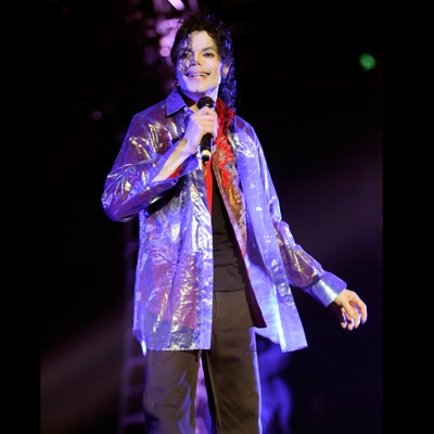 TMZ網(wǎng)站刊登的四張照片中,杰克遜看起來身形消瘦,但舞姿豐采不減。其中一張照片,杰克遜身穿紫色長袖襯衫配黑色長褲,右手拿著麥克風(fēng),笑得頗開心。