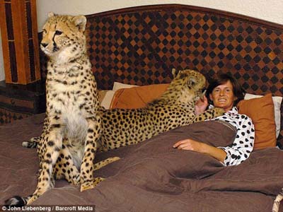 中新網(wǎng)7月3日電 據(jù)英國(guó)媒體報(bào)道,南非一名46歲女子在家中養(yǎng)了4只印度豹、5只獅子和2只老虎,她與它們同吃同住親密無(wú)間,甚至晚上睡覺時(shí)也同這些伙伴躺在一張床上。