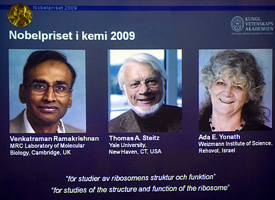 拉馬克里希南1952年出生于印度,目前持美國國籍,任職于英國劍橋MRC分子生物學實驗室;施泰茨1940年出生于美國威斯康星州,任職于美國耶魯大學和霍華休斯醫(yī)學研究所;約納特1939年出生于耶路撒冷,任職于以色列魏茨曼科學研究所。3人將平分諾貝爾化學獎獎金1000萬瑞典克朗。