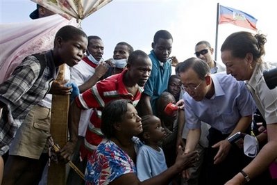 聯(lián)合國秘書長潘基文一行17日在海地了解地震造成的損失并掌握了第一手的災情資料。面對嚴峻的救援情況,日漸絕望的海地災民,在被問到是否有足夠的救援物資滿足數(shù)以百萬計的災民時,潘基文說:“我真心希望并呼吁海地人民要更加耐心”,他還表示不希望看到發(fā)生騷亂。
