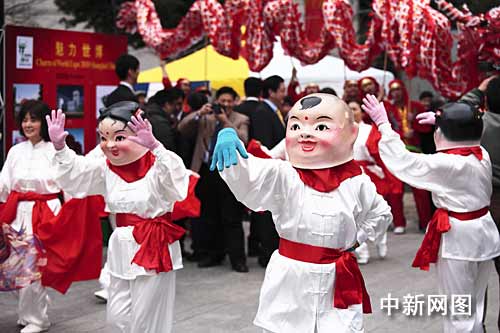 春節(jié)祭開場,各式中國傳統(tǒng)民俗表演讓日本當(dāng)?shù)厝烁惺艿搅酥袊鴿鉂獾哪晡丁N椠、旱船、大頭娃娃、太極拳,場面分外熱鬧。