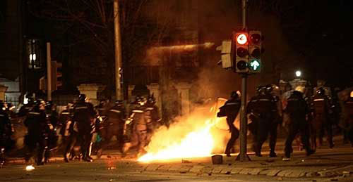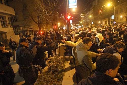 據(jù)聯(lián)合早報(bào)網(wǎng)報(bào)道,大約一千名憤怒的塞族青年,到美國大使館、一間美式快餐店和歐盟輪任主席國斯洛文尼亞大使館投擲石塊,并與防暴警察沖突,示威者又拆去歐盟旗幟,示威者又縱火、燒車,打爛大使館的玻璃窗。防暴警察以催激氣體及橡膠子彈驅(qū)散,又施放催淚氣體和出動(dòng)警棍驅(qū)散。