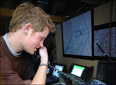 23歲的哈里王子在駐阿英軍第52旅下屬的皇室騎兵團作戰(zhàn)組服役,他在赫爾曼德省邊遠地區(qū)的任務是協(xié)調(diào)各種飛機的作戰(zhàn)行動,其中包括美國的F-15戰(zhàn)斗機、英國的“鷂”式攻擊機、阿帕奇武裝直升機、 C-130H“大力士”運輸機。他因此要和英國皇家空軍“鷂”式攻擊機女飛行員米歇爾-湯普金斯和她的同事們保持經(jīng)常性的接觸,飛行員只有在獲得他的批準后才能對目標發(fā)動攻擊。