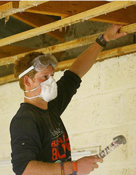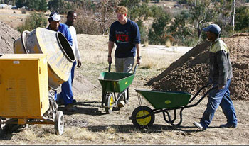身穿體恤衫、斜紋棉布褲,腳穿結實膠鞋的哈里,像其他人一樣,手推獨輪車,耐心排隊等候裝水泥,然后經(jīng)過崎嶇不平的地形,將水泥倒進新建學校的基槽中。他還幫忙挖溝,修建特殊學校有利于殘疾兒童出入的斜坡。戴上口罩和護目鏡,哈里王子還能用錘子將鋼釘釘進學校食堂頂棚的木板中。