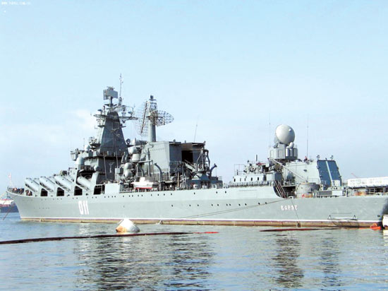 俄羅斯海軍也派出素有“航母殺手”之稱的“瓦良格”號導彈巡洋艦參加此次閱兵式。該艦已于13日從符拉迪沃斯托克的金角灣出發(fā)前往中國!巴吡几瘛碧柺嵌砹_斯太平洋艦隊的旗艦,主要武器為16枚SS-N-12超音速反艦導彈,可攜帶1000公斤裝藥的常規(guī)彈頭或射程達300海里的戰(zhàn)術(shù)核彈頭。