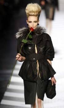 中新網(wǎng)3月10日電 據(jù)路透社報道,日前在法國知名時裝設(shè)計師高堤耶(Jean-Paul Gaultier)的服裝秀上,模特們身著用大把鈔票模樣堆砌而成的黑色禮服,而設(shè)計師克里斯汀-拉克魯瓦(Christian Lacroix)則設(shè)計出了巴洛克風(fēng)格的黃金禮服和大毛皮領(lǐng)。巴黎時裝展就是敢于走頹廢路線。
