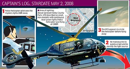 英國空中交通管制委員會21日發(fā)布的消息稱,2008年5月2日晚間21時50分,英國伯明翰警方的直升機正在城市上空進行例行的巡邏,他們突然發(fā)現(xiàn)前方不遠處的天空中有一個類似于飛碟的不明飛行物。這個外形怪異的不明飛行物體積并不龐大,并且持續(xù)不斷地發(fā)出藍綠色的光芒。直升機上的3名警察最初以為這是一架飛機模型,但隨后卻發(fā)現(xiàn)不明飛行物在向他們的方向飛了過來,最近的距離一度只有大約300英尺(約合91米),駕駛直升機的飛行員不得不立即改向進行回避。不明飛行物并沒有立即離開的意思,而是圍繞著英國警方的直升機飛行,看起來就像是在故意嘲弄和挑釁。伯明翰警方當時將這一情況用無線電報告給了英國軍方和空中交通管制部門。