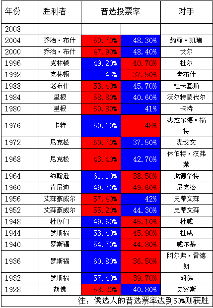 80年來美國總統(tǒng)選舉得票情況一覽表(圖表來源:星島環(huán)球網(wǎng))