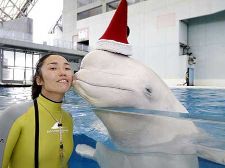 中新網(wǎng)12月19日 綜合媒體報(bào)道,由于圣誕節(jié)將至,日本橫濱八景島海洋樂(lè)園為了吸引更多的游客前來(lái)游覽亮出奇招,給館內(nèi)的兩頭白鯨戴上可愛(ài)的圣誕帽,前來(lái)游覽的游客甚至有機(jī)會(huì)得到這兩頭戴著圣誕帽的白鯨的親吻。