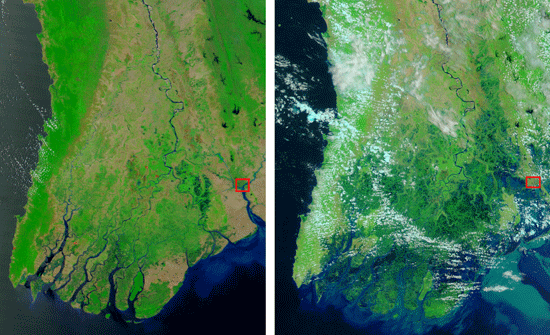 左邊的衛(wèi)星圖片是4月15日拍攝的,人們可以看到伊洛瓦底江向南流去,分成眾多的支流。在有植被和農(nóng)田覆蓋的背景下,人們可以很清晰地看到河流和湖泊。