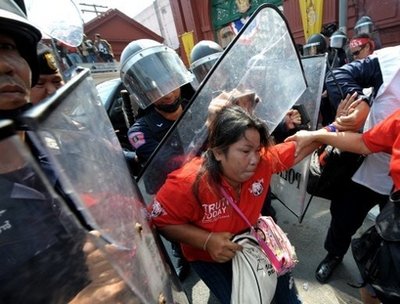 示威者投擲鐵欄泄憤,有人用磚砸爛議員的汽車,防暴警察組成人鏈,防止示威者沖擊。一名記者鼻梁被石擊中,一名防暴警察頭部也受傷,警方一度要增援。示威者其后散去。據(jù)報(bào),他信的支持者亦在東北部多個(gè)省分示威,抗議阿披實(shí)當(dāng)選。