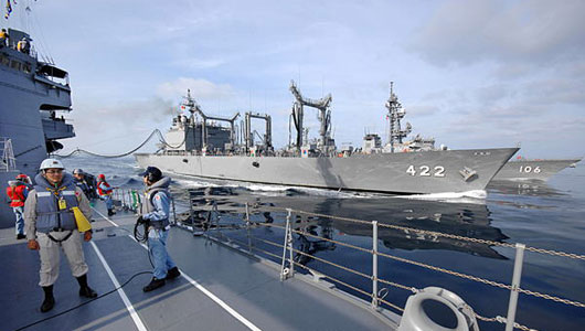 兩艘護衛(wèi)艦14日從日本廣島縣吳基地出發(fā),28日曾接受依據(jù)新《反恐特措法》在印度洋執(zhí)行任務(wù)的海上自衛(wèi)隊補給艦的供油。