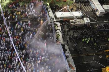 6月28日,韓國警方再次動(dòng)用高壓水龍驅(qū)散大批示威者。