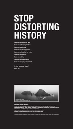 網(wǎng)民們還選定了廣告內(nèi)容。Daum從4日至12日,在網(wǎng)站公布了某廣告公司免費(fèi)制作的三個廣告試案,并征求眾網(wǎng)民意見。結(jié)果,58.6%的網(wǎng)民選擇了“STOP DISTORTING HISTORY(停止歪曲歷史)”這一廣告文案。
