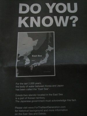 據(jù)《朝鮮日報》報道,韓國門戶網(wǎng)站Daum表示,用11萬余名網(wǎng)民募捐的資金,于25日(當(dāng)?shù)貢r間)在《華盛頓郵報》刊登了整版的獨(dú)島廣告。廣告執(zhí)行者由徐景德?lián),他曾?月份在歌手金長勛等人的贊助下,在《紐約時報》刊登了獨(dú)島宣傳廣告“DO YOU KNOW?(你知道嗎)”。